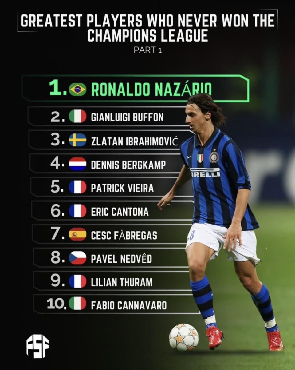 mk体育app-从未赢得欧冠冠军的最伟大球员榜单发布!大罗高居第一 伊布上榜